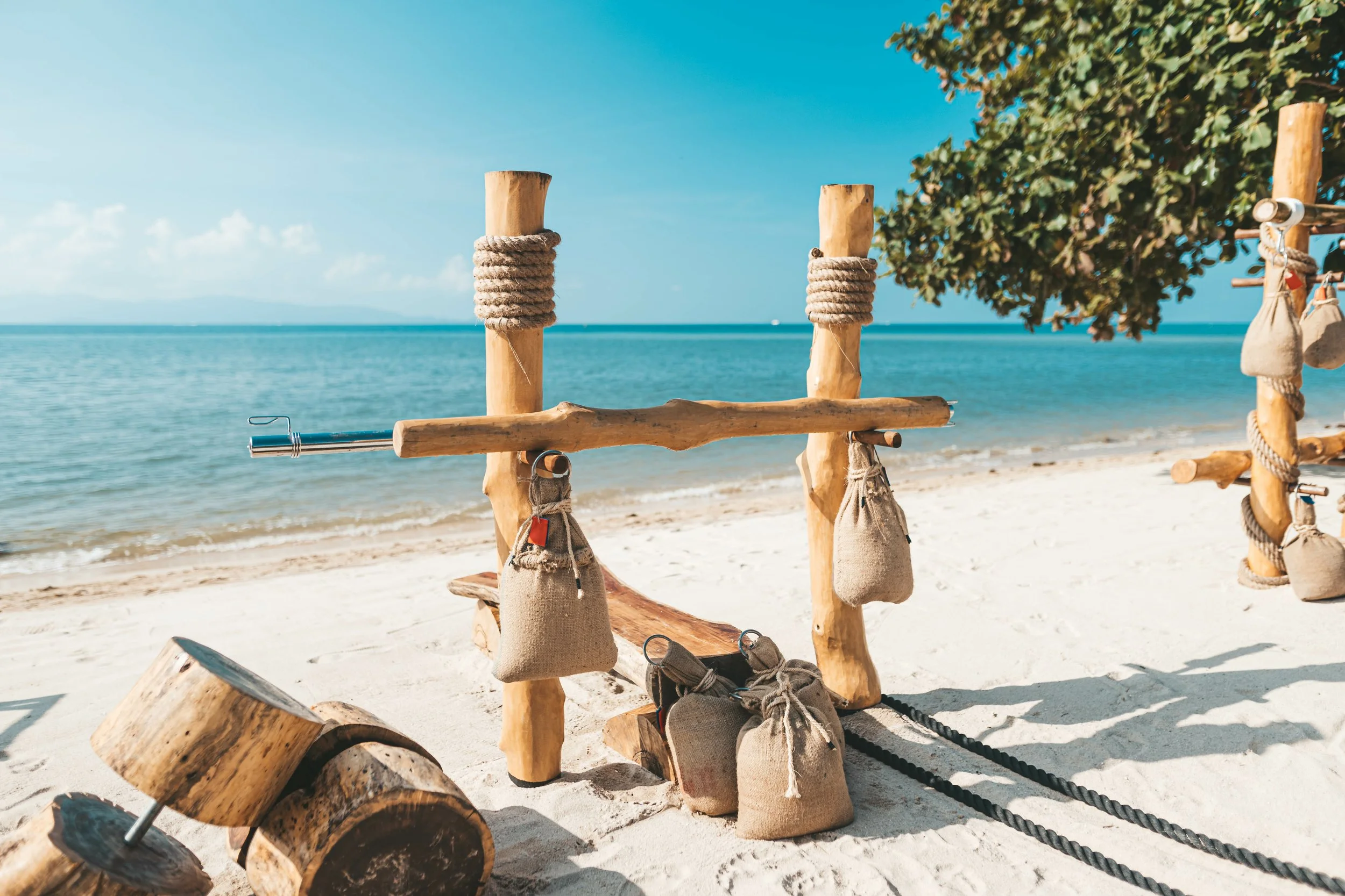 A coastal gym where strength meets nature—train with bamboo pulleys and timber ropes, powered by the sun and sand